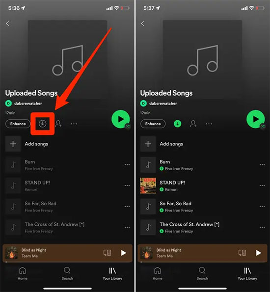ステップ 3. 「あなたのライブラリ」オプションをタップして、音楽ライブラリに戻り、ローカルオーディオファイルがあるプレイリストを選択します。プレイリストの名前の下に、下矢印のように見えるダウンロードアイコンをクリックして、このようにプレイリストのSpotify WAV曲が携帯電話にダウンロードされ、保存されます。